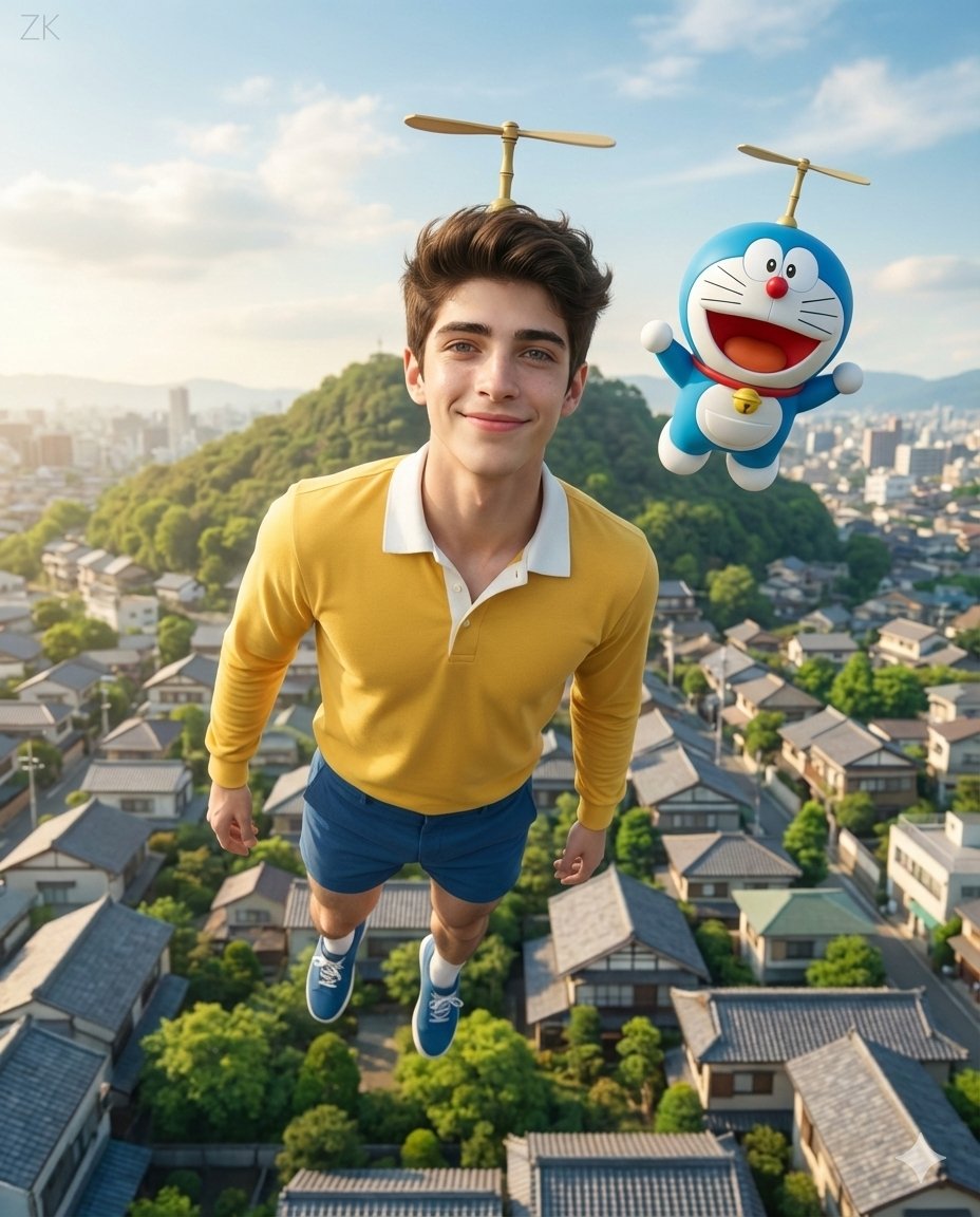Create a realistic, high-angle image, looking down from the sky. It shows me with the face from the attached file, wearing a long-sleeved yellow polo shirt with a white collar, the shirt neatly tucked into blue shorts, and blue shoes. I am floating in the sky using a small bamboo copter attached to my head, flying towards the camera, alongside Doraemon, who is also flying next to me with a small bamboo copter attached to his head. Both of us look joyful.