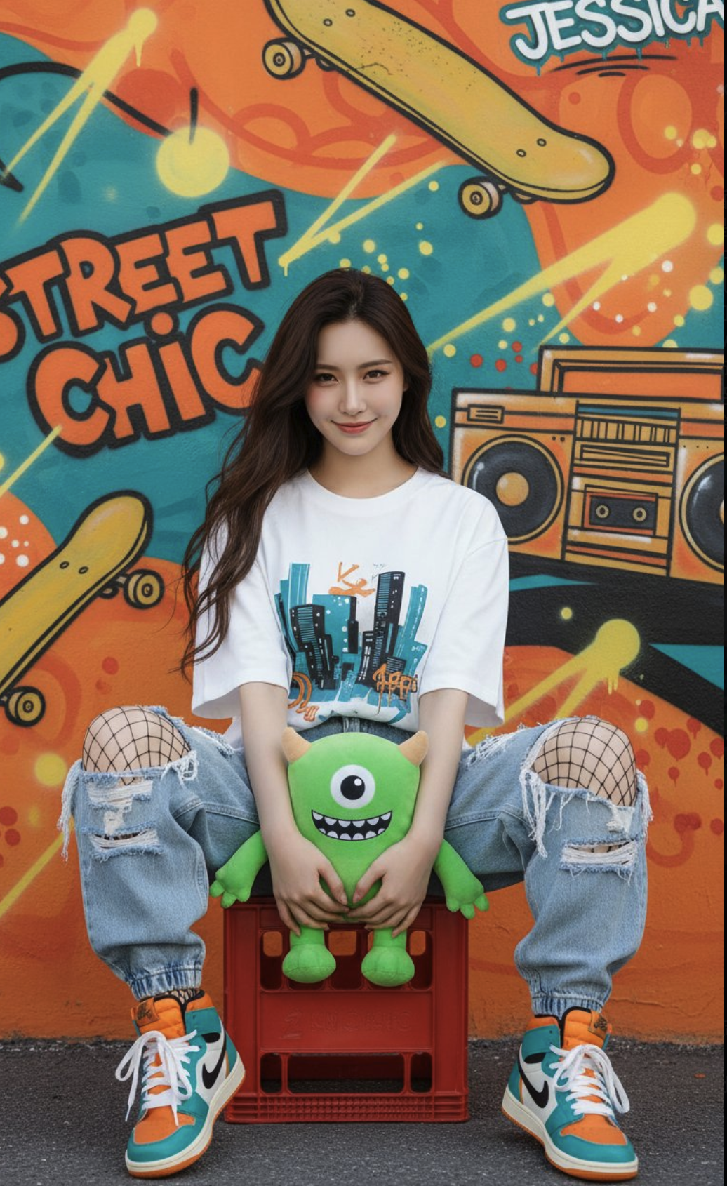 A full-body studio portrait of a handsome young East Asian woman with flawless fair skin and beautiful, long flowing dark hair. She is sitting casually on an overturned milk crate in front of a vibrant, graffiti-style orange and teal backdrop. She is wearing an oversized graphic t-shirt, baggy ripped jeans, and colorful high-top sneakers. Playfully holding a cool, cartoon-style monster plushie, she smiles at the camera with a cheeky, energetic expression. The background is decorated with bold, spray-painted yellow and black urban art and text, including "STREET CHIC", "JESSICA", skateboards, boomboxes, and dynamic lines, in the style of a streetwear lookbook or a hip-hop album cover. The lighting is bright and edgy, emphasizing the dynamic and youthful vibe. Use the exact same face as in the uploaded image, no alteration, 100% unchanged. Remove her earrings.