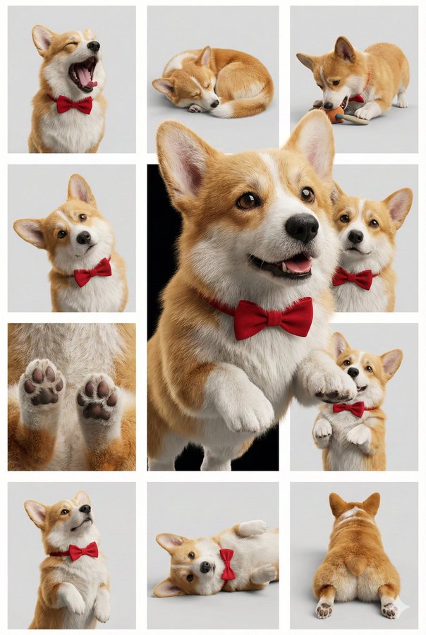 Surreal 3x3 grid collage with THICK WHITE LINES. Background shows [小动物详细描述] in 8 different cute behaviors and angles (yawning, sleeping, playing, tilting head, close-up of paws). CENTER CELL HIDDEN. OVERLAID by a massive hyper-realistic full-body 3D cut-out of the SAME [小动物详细描述] jumping forward out of the grid playfully. ALL elements sharp, deep depth of field f/16, no bokeh, bright softbox lighting to highlight fur texture, tactile fluffy details, strong 3D pop-out effect, 8k resolution, C4D render style --ar 2:3 --v 6.1