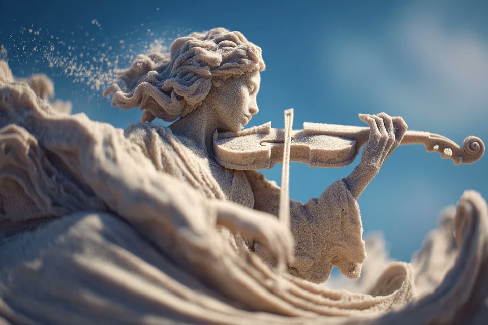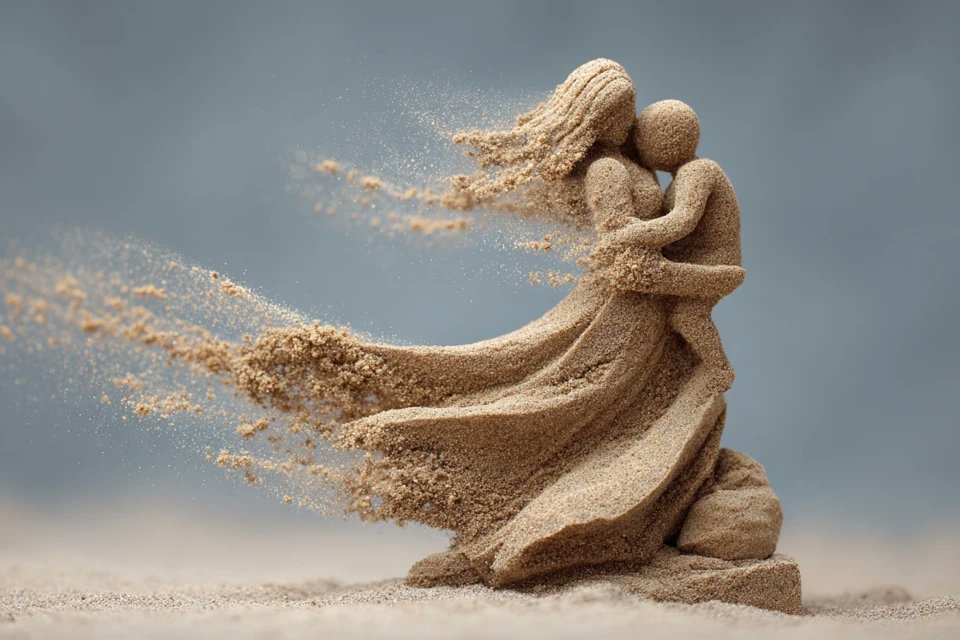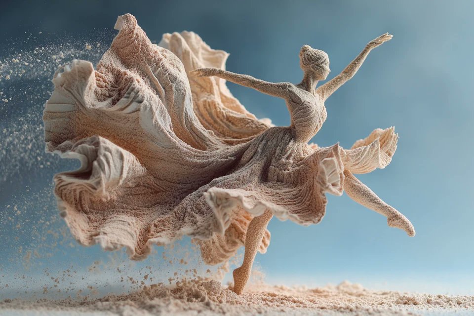 Prompt share: kinetic sand sculpture 💬Prompt: A kinetic sand sculpture of a [subject], fine-grain texture and flowing edges, caught mid-collapse, ambient natural lighting, soft tones of [color1], [color2], and [color3], photographed in a windswept coastal blue setting. Check ATLs for inspiration ✨