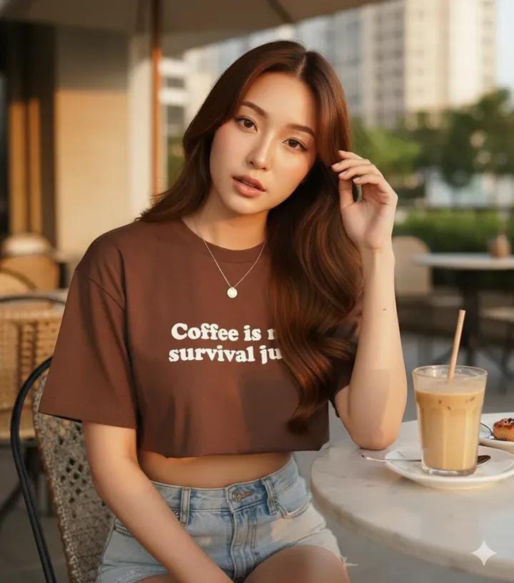 feathery lashes. She has a natural, soft pink blush on her cheeks and a glossy pink lip color. She is wearing a loose brown cropped midriff t-shirt that says "Coffee is my survival juice" in a retro medium sized font. She wears a delicate silver chain necklace with a small circular pendant. She is holding up a cup of iced latte with straw. The background is softly blurred, showing hints of a modern balcony with reflective surfaces and warm lighting. The overall lighting is soft and even,