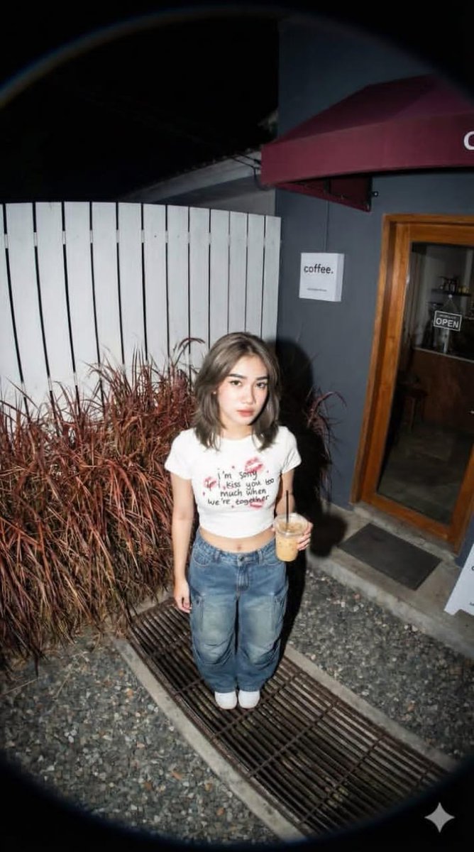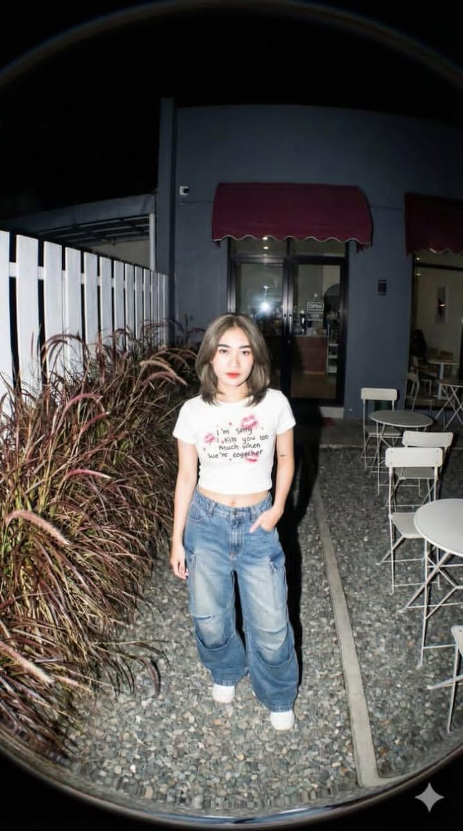 Subject: Woman with ash brown hair, wolf cut. Wearing the outfit shown in the second image. White sneakers. Small, cat-eye sunglasses.