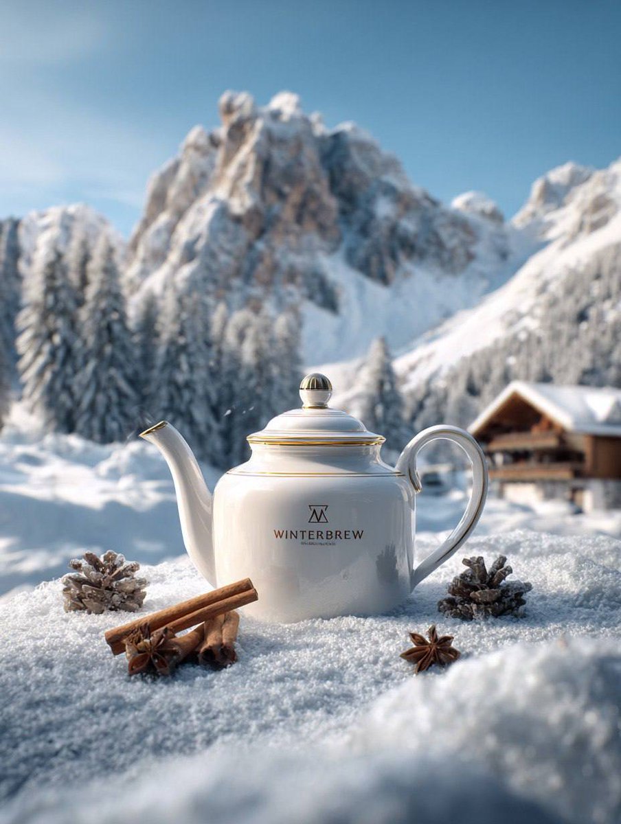 Insert specific object here, e.g., "A white ceramic teapot with gold trim and 'WINTERBREW' logo," "A clear glass perfume bottle with silver cap and 'ALPINE ESSENCE' text," or "A pair of brown leather hiking boots covered in light snow.")
