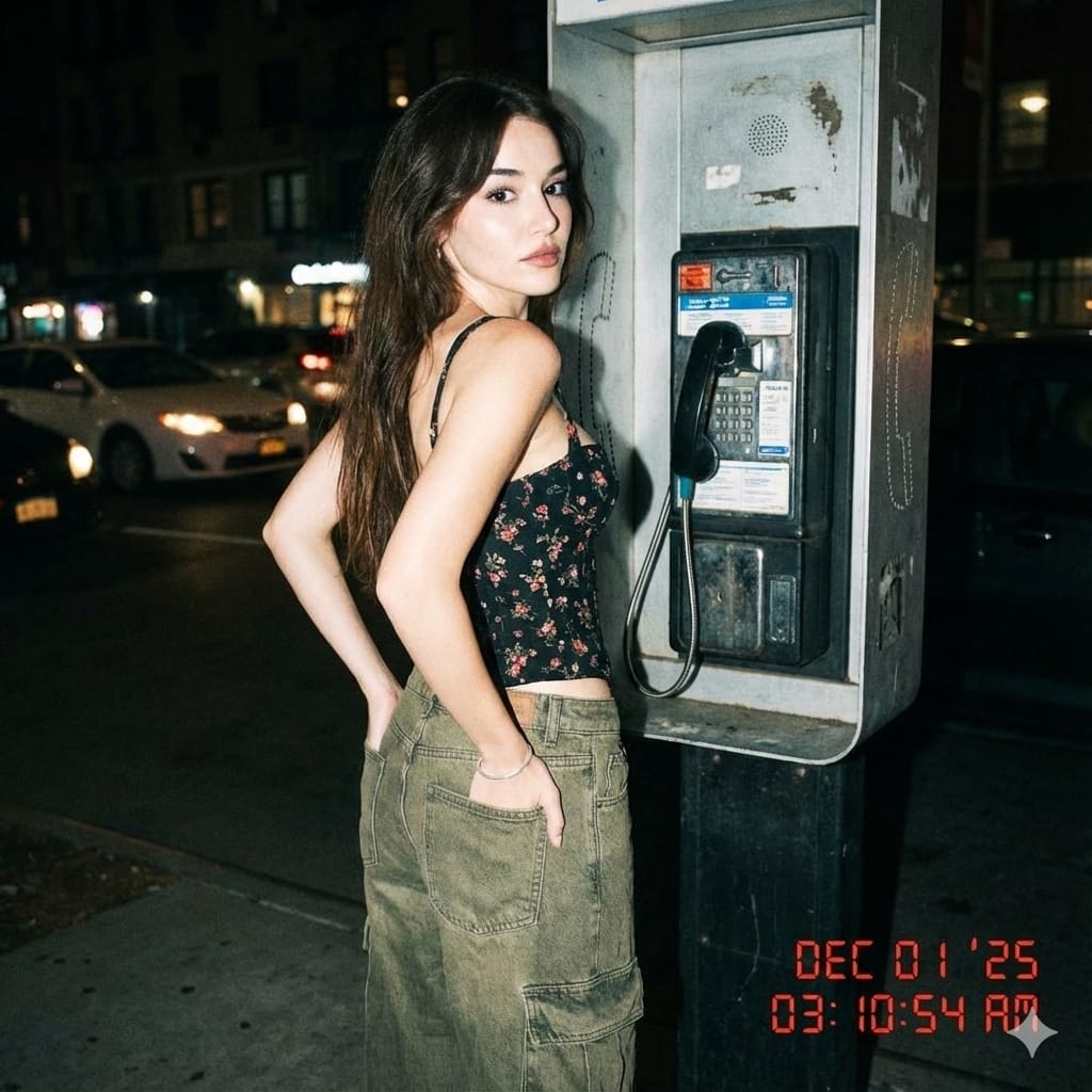 Nighttime flash photo with Y2K aesthetic, red digital timestamp in corner. Young woman at a public payphone, face based on uploaded image, turning back toward camera with a detached look. Wearing corset top and loose cargo jeans, nands in back pockets. Strong flash contrast and blurred car lights in urban background, raw early-2000s paparazzi vibe.
