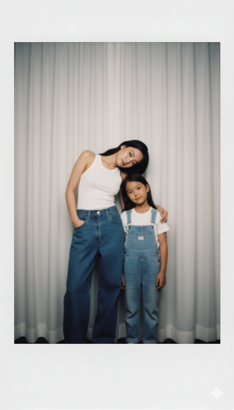These two photos are of the same girl, one as a child and one as her grown-up self. Merge them into a single highly realistic image. The grown-up version should gently lean toward and stand close to her child self, as if taking a selfie together. Keep both faces unchanged and as accurate as the original photos. The shot should be from a slightly high angle, wide-angle lens style, as if captured with a real smartphone. Use a clean white background with even soft lighting, making the atmosphere natural and candid. Ensure both the child and adult versions look directly at the camera, with a realistic sense of closeness and continuity in age progression.