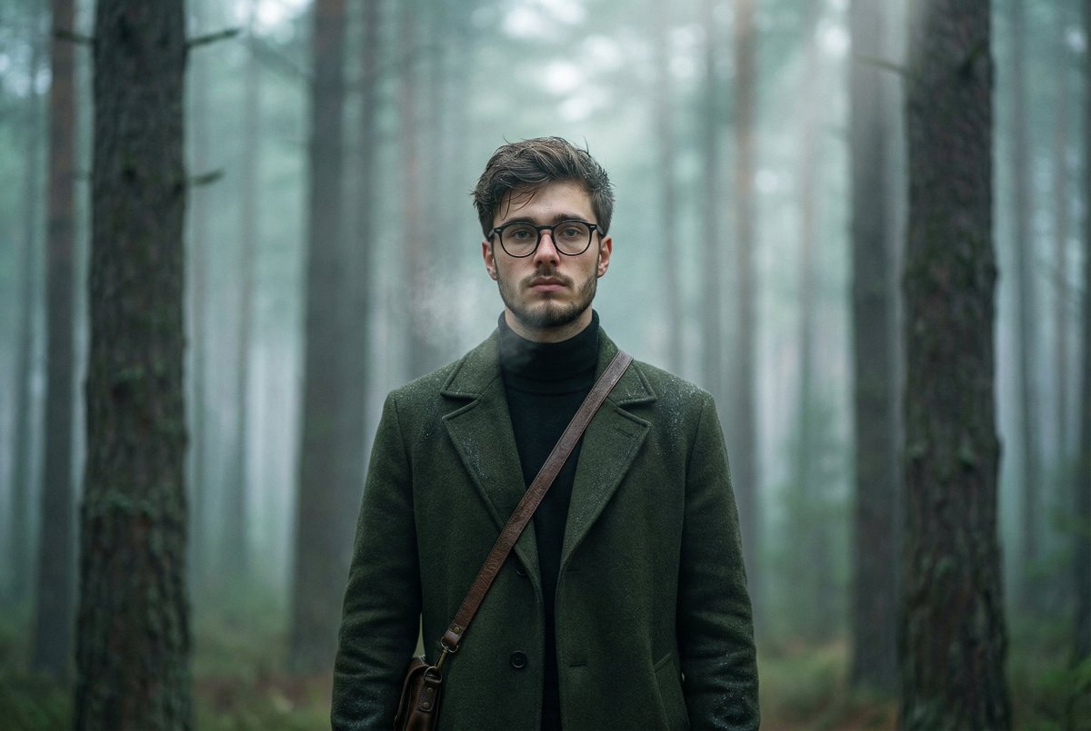 "description": "A person wearing a dark moss-green wool overcoat that flows slightly with movement, a charcoal turtleneck, and a vintage leather satchel strap across the chest. Heavy boots show traces of wet soil and pine needles. Fine moisture beads on fabric and hair, droplets visible on eyelashes and brows.",