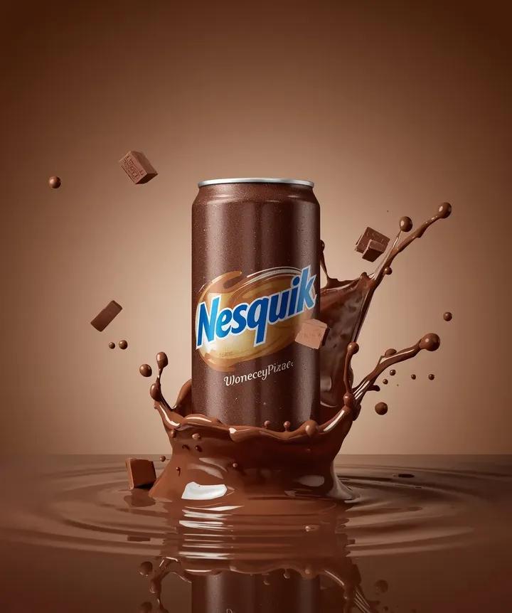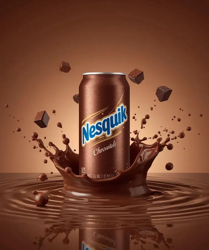 "prompt": "Ultra-realistic premium beverage product photography of a chilled chocolate drink aluminum can standing upright at the exact center of the frame, featuring a deep cocoa-brown matte metallic body with the 'Nesquik' logo prominently displayed on the front in bright blue and white typography, subtle handwritten-style accent text beneath, and fine condensation droplets covering the can surface to emphasize cold freshness; the can is emerging from and partially surrounded by dynamic liquid chocolate splashes and a dusting of cocoa powder.",