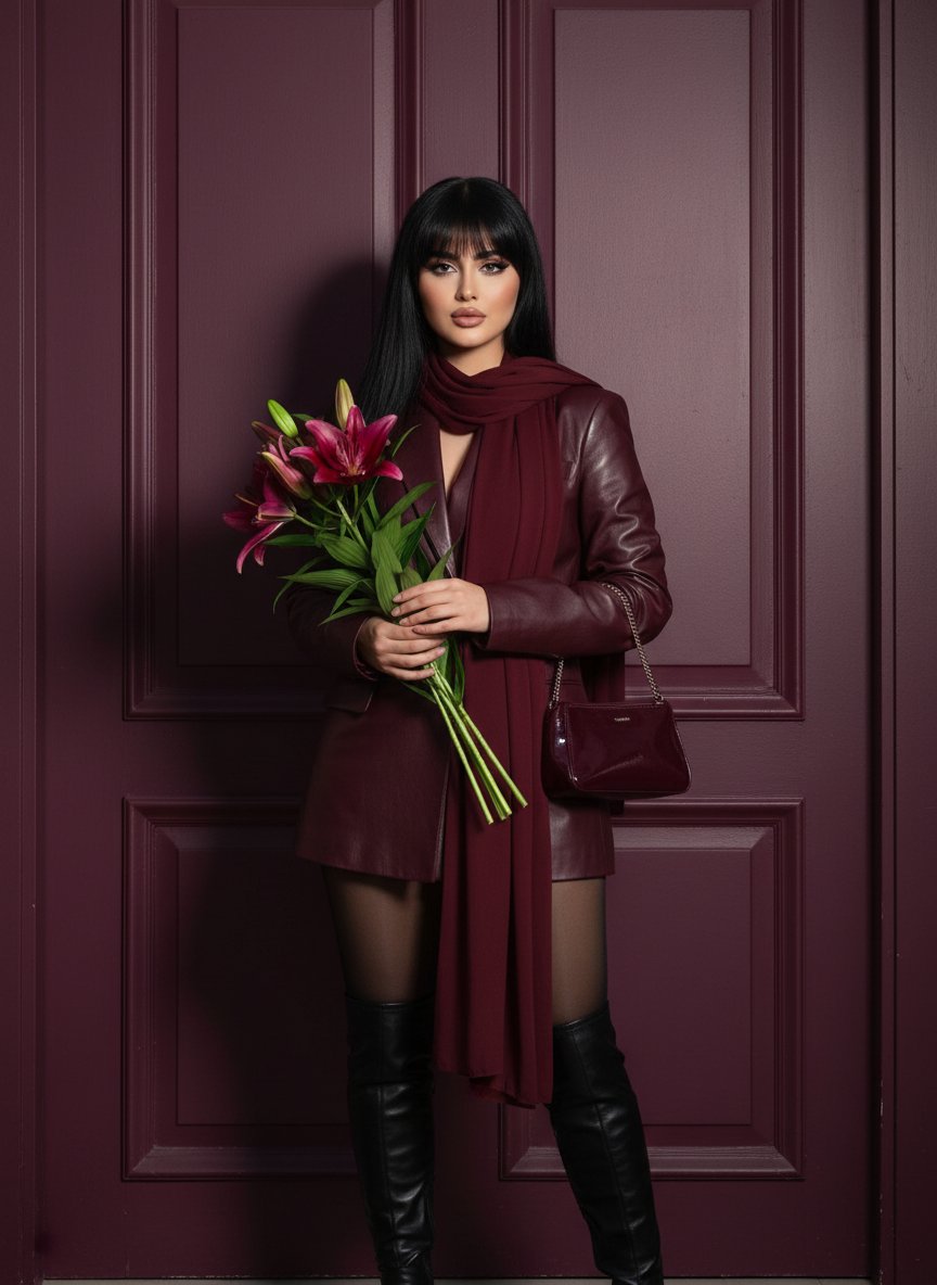 Create a fashion product collage on a brown corkboard based on this outfit. Each product and the central model image should be presented as individual photos with distinct white borders, pinned organically and aesthetically to the board with small descriptive labels."