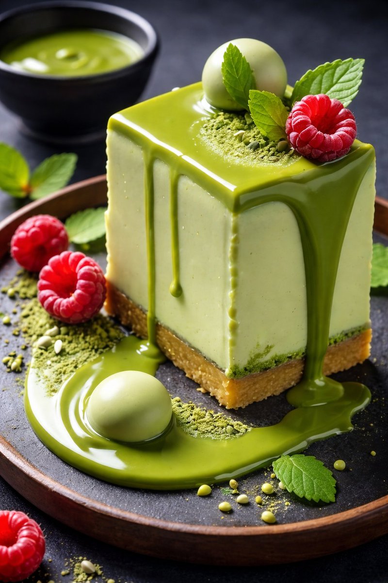 "plate": ["extra raspberry", "mint leaves", "matcha powder"]