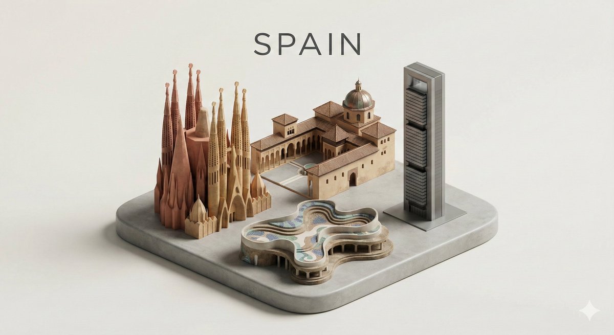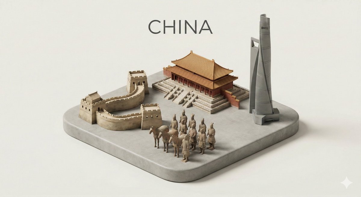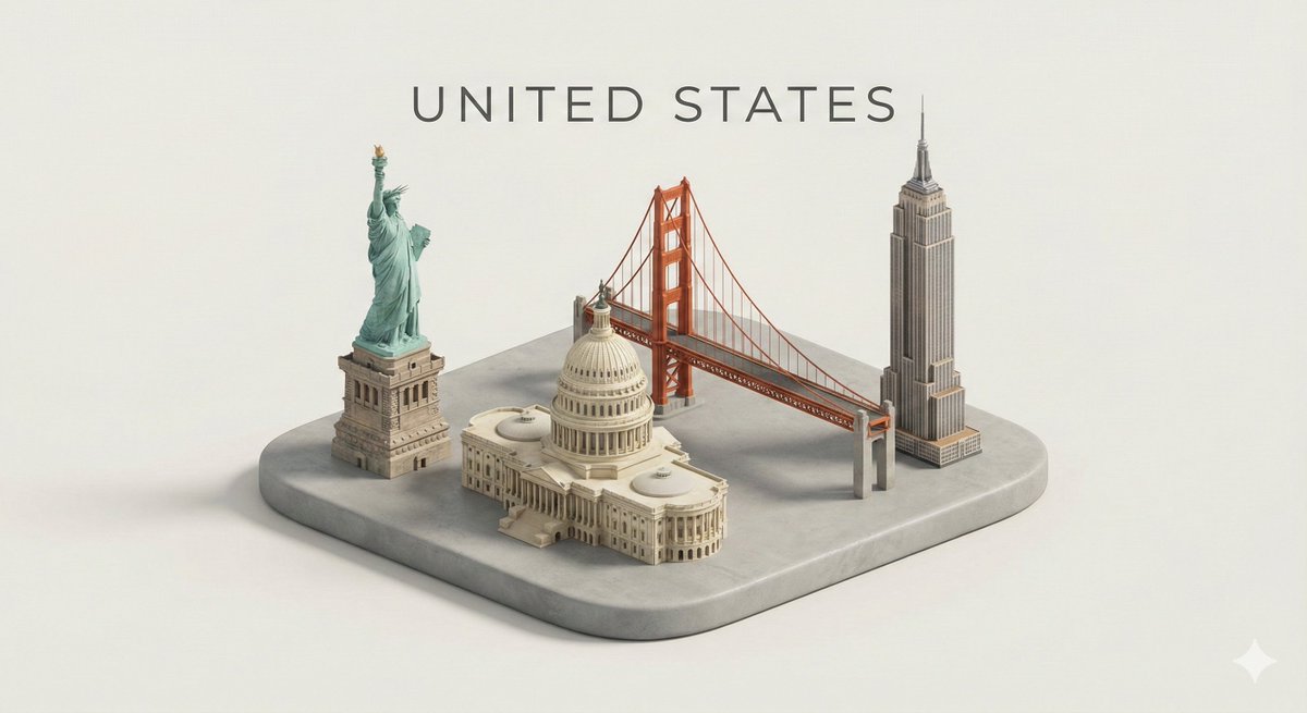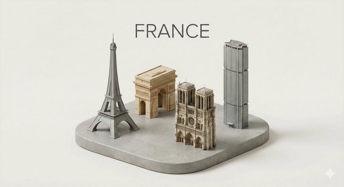 A clean, minimal 3D isometric diorama depicting a curated collection of iconic landmarks from [COUNTRY NAME], arranged as a cohesive miniature architectural set. Each landmark is thoughtfully simplified and stylized while remaining instantly recognizable, unified through consistent scale, geometry, and a restrained material palette.