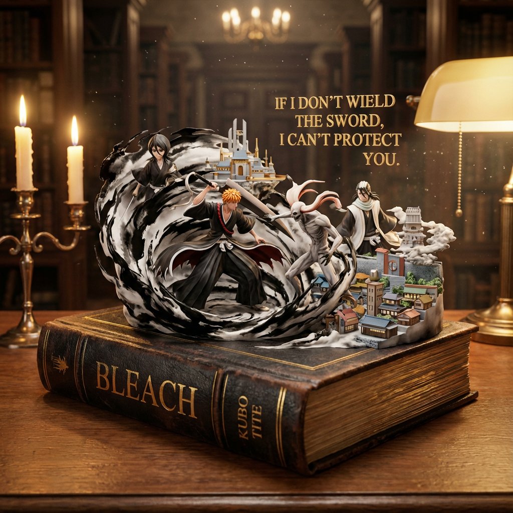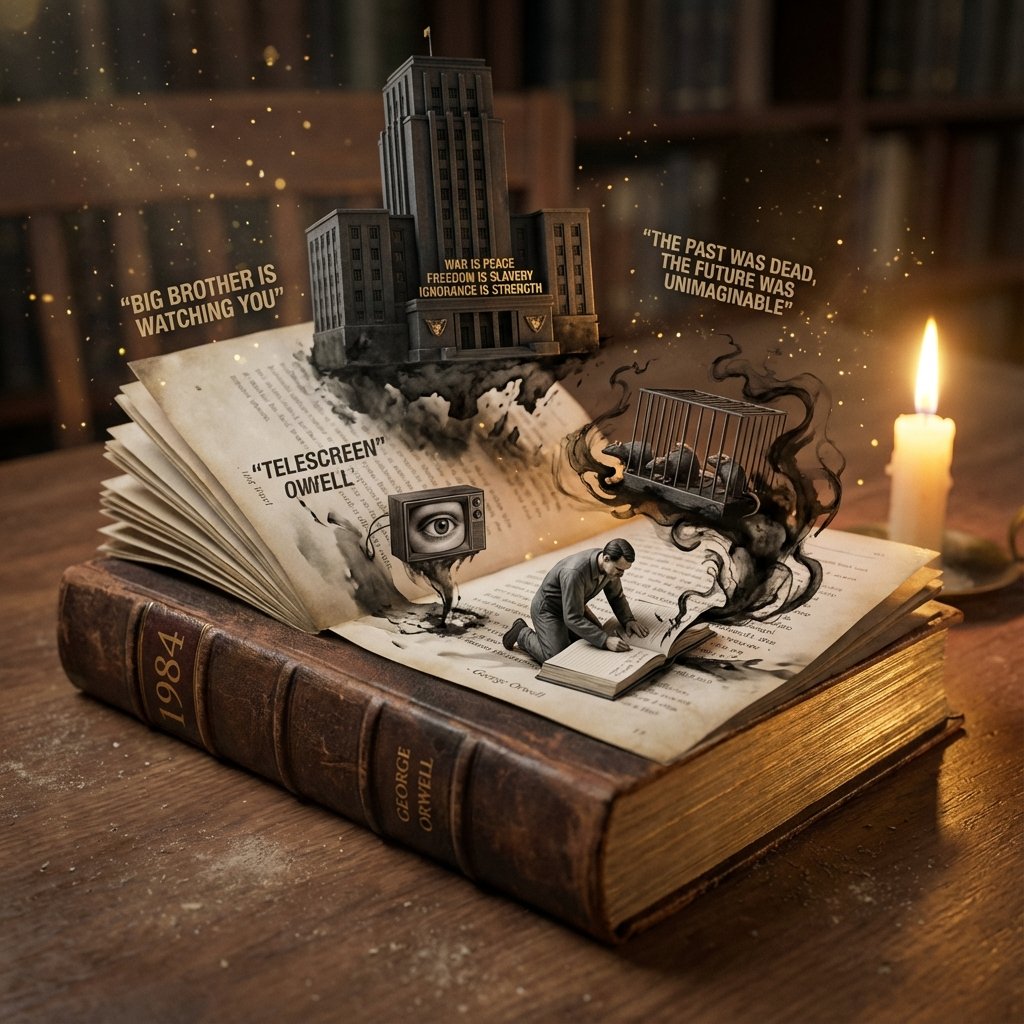<instruction> Input A is a classic novel or book title. Analyze the setting, the protagonist’s journey, and the core motif. Goal: A high-end leather-bound book lying open, where the story is physically erupting from the pages in 3D. Rules: - The base: A thick, weathered book with gilded edges. - The scene: Characters and landscapes emerge from the paper as if made of a mix of "ink-wash" and "hyper-real miniatures." - Details: Include "floating" sentences or iconic quotes as tiny physical gold letters swirling in the air. - Lighting: Warm library glow, candlelight flickering, dust motes visible in the air. - Output: ONE image, 4:5. The book title is visible on the spine and cover. </instruction>Here is another prompt to bring books to life. Probably need to refine but fun i