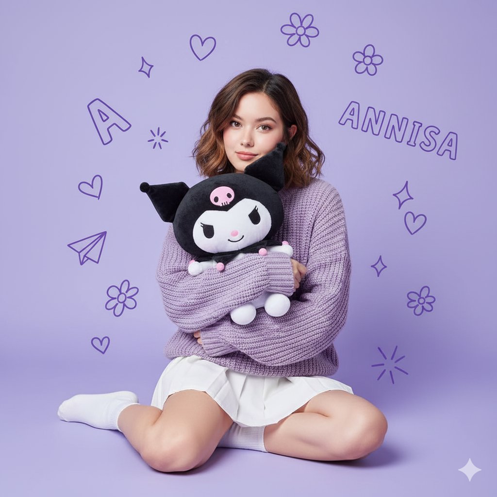 A full-body studio portrait of a handsome young East Asian woman sitting on the floor in front of a light purple backdrop. She is wearing a cozy, oversized lavender chunky-knit sweater, white skirt, and white socks. She is affectionately hugging a large Sanrio Kuromi plushie and looking at the camera with a gentle expression. The background is decorated with playful, hand-drawn purple doodles and text, including "A", "ANNISA", paper airplanes, and flowers, in the style of a K-pop photocard or fanzine cover. The lighting is bright and soft, enhancing the cute and affectionate mood. Use the exact same face as in the uploaded image, no alteration, 100% unchanged. Remove her earrings.