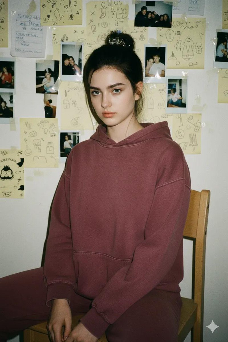 Same face, hit with an unforgiving flash that nukes the shadows. Her hair is shoved back with a cheap plastic clip, a few wild strands catching the glare. She stares dead-on, expression sharp and challenging. She wears a washed-out maroon hoodie. Behind her: a wall of torn notebook pages, doodles, and crooked polaroids. Heavy grain, blown highlights, raw 90s energy.