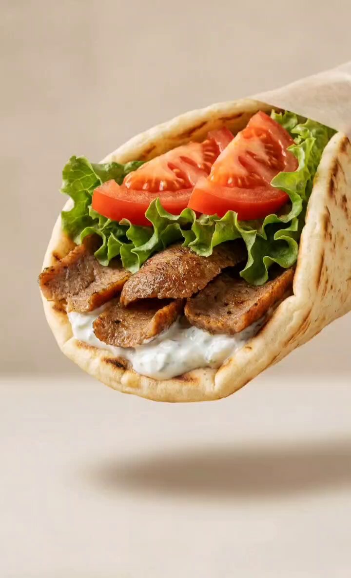 – Background color of each block corresponds subtly to the ingredient color (tomato red, lettuce green, meat warm brown, sauce white/cream, pita beige)