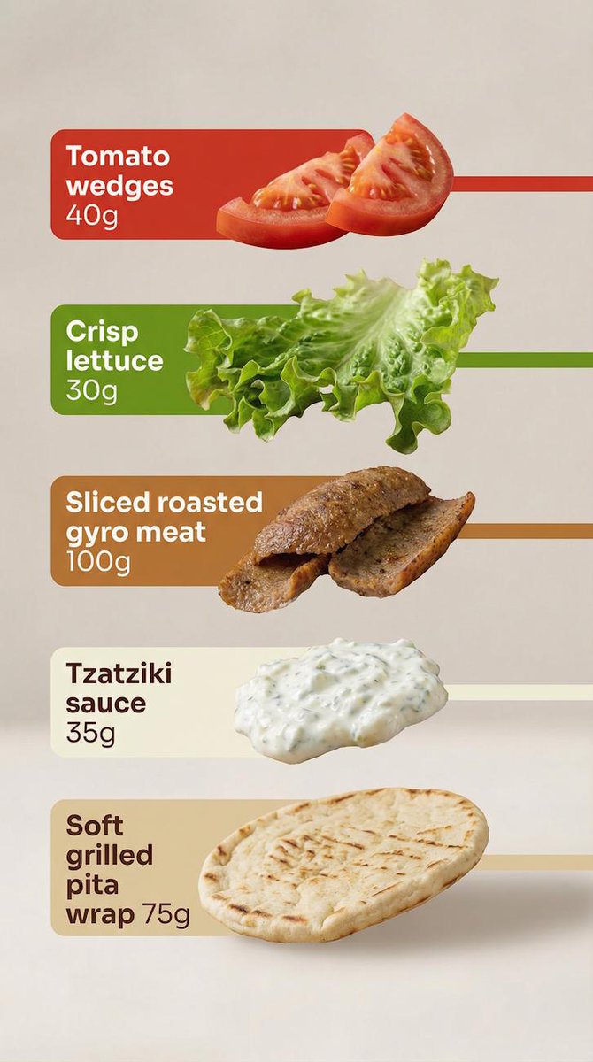 Image Prompt: Exploded vertical breakdown of the same gyros.