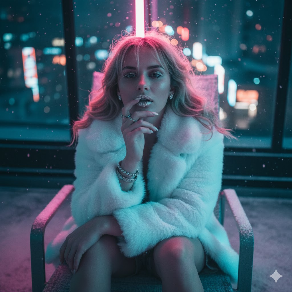 "Soft neon glow bouncing off snowflakes on her sleeves"