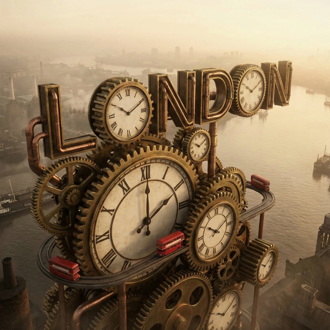 prompt: A giant, 3D rendition of the word "LONDON" engineered from Victorian clockwork gears and Big-Ben-style clock faces, their hands ticking in synchronized rhythms. Mini red double-decker buses circulate along brass cog teeth. Foggy dawn, sepia-toned light leaks.These prompts are so much. You can do them for any city. prompt: A giant, 3D re
