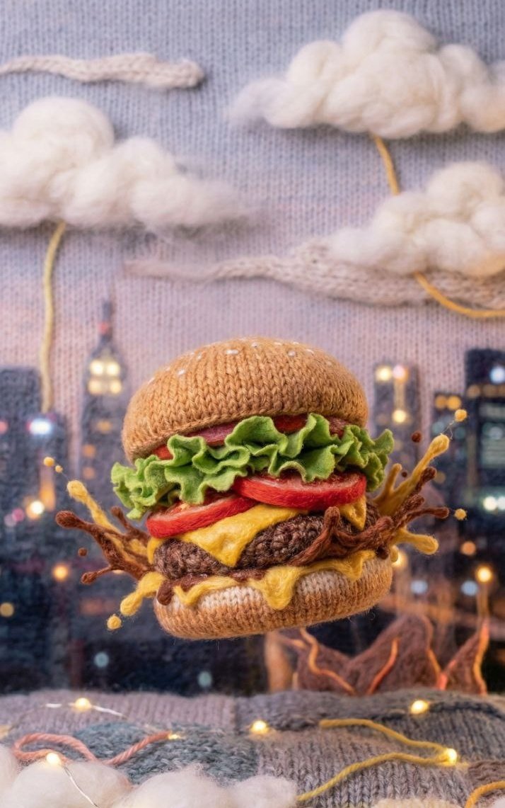 “Transform this scene into a world of handcrafted textiles. Preserve the original composition, perspective, objects, and layout. All elements are recreated using soft wool, yarn, felt, and knitted textures. Maintain the original colors and lighting, but reinterpret them through textile materials: visible stitches, knitted surfaces, woolen fibers, and needle-felted details.
