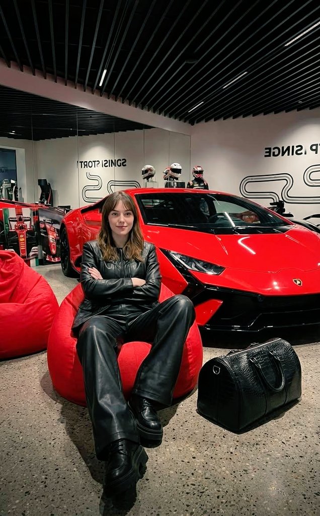 "mirrored_wall": "reversed silhouettes of showroom signage, racing helmet displays, and stylized circuit-track outlines"