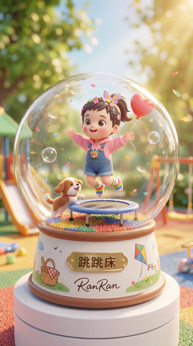 感谢神佬这个ideal,我用来做了我女儿的专属水晶球回忆,也就是图生图啦😊 这样是不就有商业价值了,无脑@xiaojietongxue 😂 提示词微改了下(可配置部分可自行DIY): If a reference image is provided, strictly adhere to the character's appearance in the uploaded image; if no reference image is provided, ignore this instruction. High-quality 3D render, Pixar animation style, Cute Chibi collectible snow globe, Miniature photography feel, Tilt-shift lens, shallow depth of field. Inside the globe, a cute Chibi [AUTO_CHARACTER] wearing [AUTO_OUTFIT] with [AUTO_DETAIL_1] and [AUTO_DETAIL_2], [AUTO_EQUIPMENT_1], and [AUTO_EQUIPMENT_2] is in a dynamic [AUTO_ACTION], [AUTO_EXPRESSION]. [AUTO_COMPANION,AUTO_COMPANION_ACTION]. The "ground" beneath them is [AUTO_GROUND]. Suspended elements: [AUTO_PARTICLE_1], [AUTO_PARTICLE_2], and [AUTO_PARTICLE_3]. Crystal clear glass, slight caustics, volumetric lighting inside mimicking [AUTO_LIGHTING]. Heavy [AUTO_BASE] base with [AUTO_BASE_DETAIL]. Luxurious [AUTO_PLAQUE] plaque engraved "[SPORT_NAME]" with handwritten signature "RanRan" in flowing calligraphy. Placed on [AUTO_PEDESTAL] with [AUTO_LIGHT_SETUP]. Background is beautifully blurred bokeh of [AUTO_ENVIRONMENT]. [AUTO_ATMOSPHERE], creating [AUTO_LIGHT_EFFECT]. [AUTO_MOOD] atmosphere. --ar 9:16 --v 6.0 可配置部分: | 变量名 | 填充值 | |--------|--------| | `[AUTO_CHARACTER]` | 小女孩(**若上传了参考图,请严格依据图中小女孩的面部特征、发型、肤色等还原;若无参考图,则使用以下默认设定**) | | `[AUTO_OUTFIT]` | 粉色连帽卫衣和牛仔背带裤 | | `[AUTO_DETAIL_1]` | 马尾辫上系着蝴蝶结 | | `[AUTO_DETAIL_2]` | 脚踩彩虹条纹运动袜 | | `[AUTO_EQUIPMENT_1]` | 手里抓着一只红色心形气球 | | `[AUTO_EQUIPMENT_2]` | 脖子上挂着小熊吊坠 | | `[AUTO_ACTION]` | 在跳跳床上高高弹起,双臂张开 | | `[AUTO_EXPRESSION]` | 开心大笑,眼睛弯成月牙 | | `[AUTO_COMPANION]` | 一只毛茸茸的小狗 | | `[AUTO_COMPANION_ACTION]` | 在跳跳床边蹦跳着想扑上去 | | `[AUTO_GROUND]` | 彩色橡胶颗粒铺就的游乐场地面 | | `[AUTO_PARTICLE_1]` | 飘浮的蒲公英种子 | | `[AUTO_PARTICLE_2]` | 闪亮的彩色纸屑 | | `[AUTO_PARTICLE_3]` | 悬停的肥皂泡泡 | | `[AUTO_LIGHTING]` | 春日午后柔和阳光 | | `[AUTO_BASE]` | 陶瓷 | | `[AUTO_BASE_DETAIL]` | 手绘风格的野餐篮与风筝图案 | | `[AUTO_PLAQUE]` | 珐琅 | | `[SPORT_NAME]` | 跳跳床 | | `[AUTO_PEDESTAL]` | 白色亚克力旋转展示座 | | `[AUTO_LIGHT_SETUP]` | 环形柔光灯加金色反光板补光 | | `[AUTO_ENVIRONMENT]` | 公园绿树与滑梯、秋千的虚化背景 | | `[AUTO_ATMOSPHERE]` | 温暖微风轻拂 | | `[AUTO_MOOD]` | 纯真、欢快、充满童年回忆 |