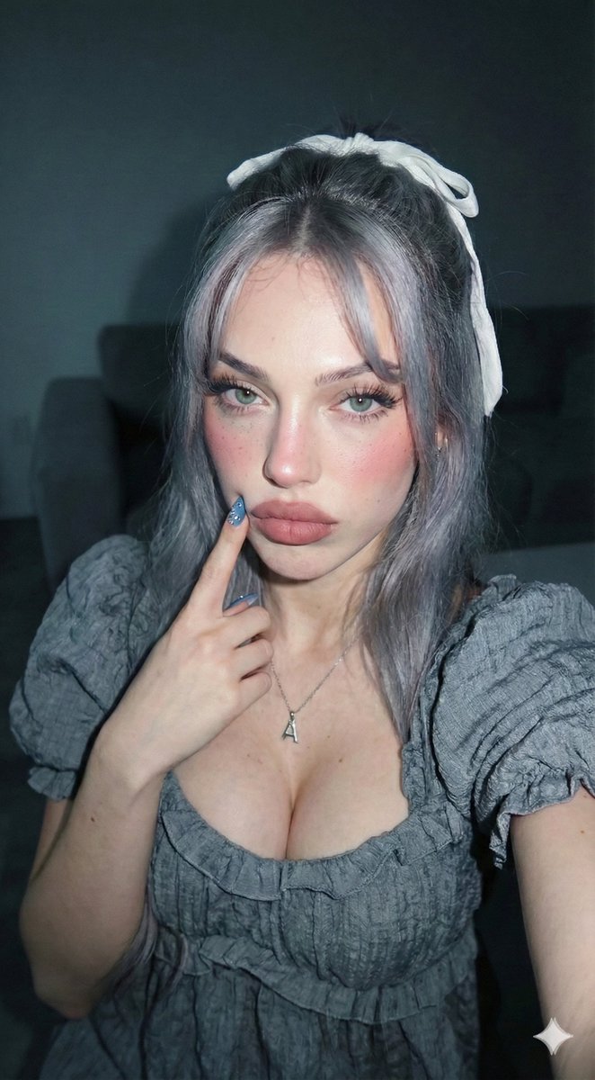 "stable_diffusion_format": "high angle selfie, 30 degree angle, beautiful woman, long wavy hair half-up with white ribbon knot, thin bangs, doll-like makeup, matte rose lips, soft blush, freckles, textured gray dress puff sleeves, 'A' pendant, blue almond nails with crystals, pouting expression finger on cheek, strong direct camera flash, dark minimalist gray living room, film noir aesthetic, cool tones, shiny skin texture, high contrast, ultra-realistic, 8k, highly detailed --no altered face, warm lighting, vector, painting",