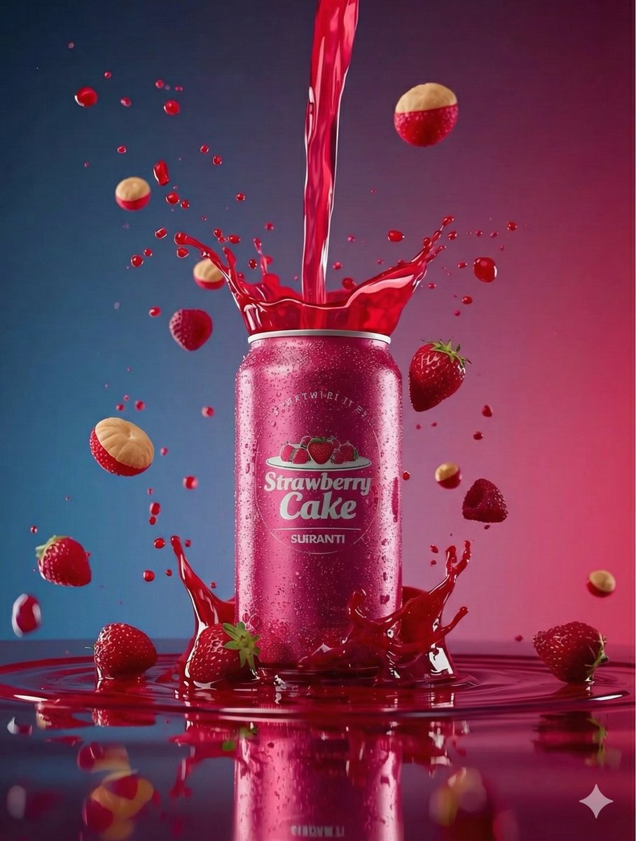 "container_description": "perfectly upright can, covered in realistic condensation, with a crisp and readable “Strawberry Cake” label"
