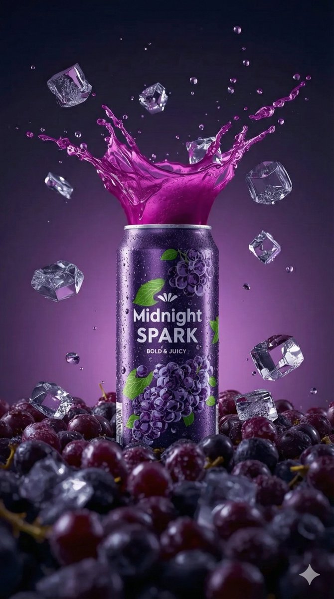 "liquid_action": "dramatic splash of vivid purple grape juice erupts upward and outward from behind the can in a symmetrical crown-like motion",