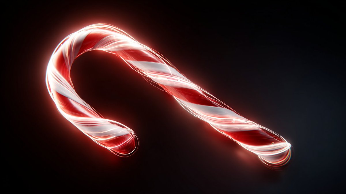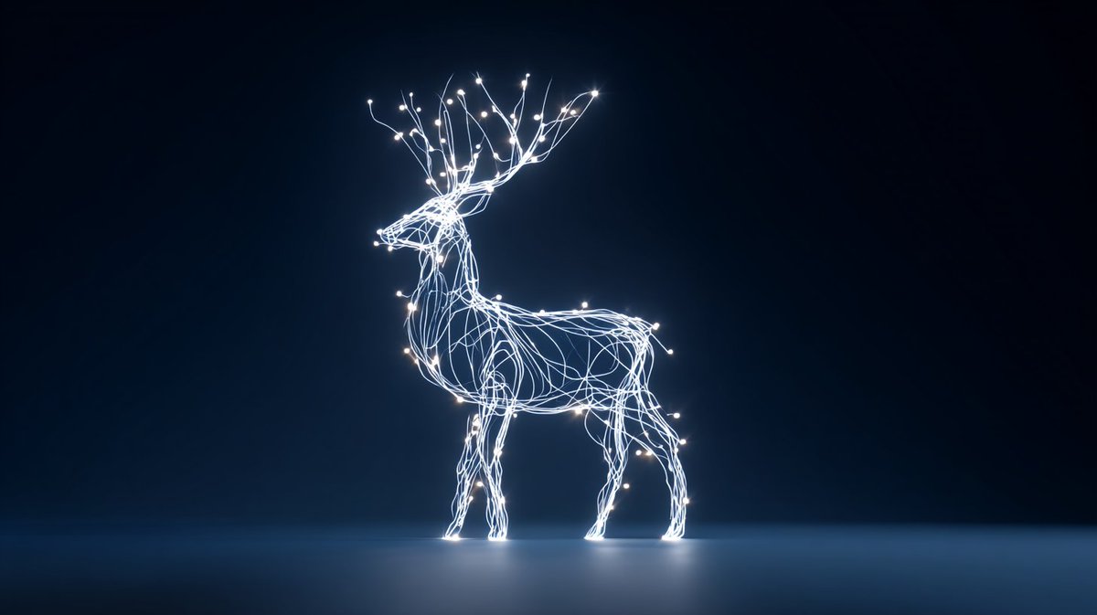 a christmas [main festive element] made of glowing [line or light material], [additional christmas elements or decorations around it], dark background, digital art style, simple illustration, cartoon style, high resolution, high detail, 3d render, sharp focus, studio lighting.