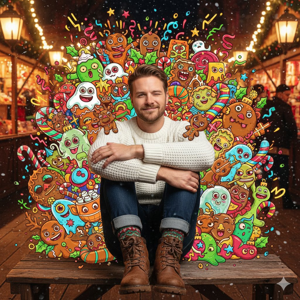 "behind_subject": "background filled with overlapping Christmas monsters and shapes",