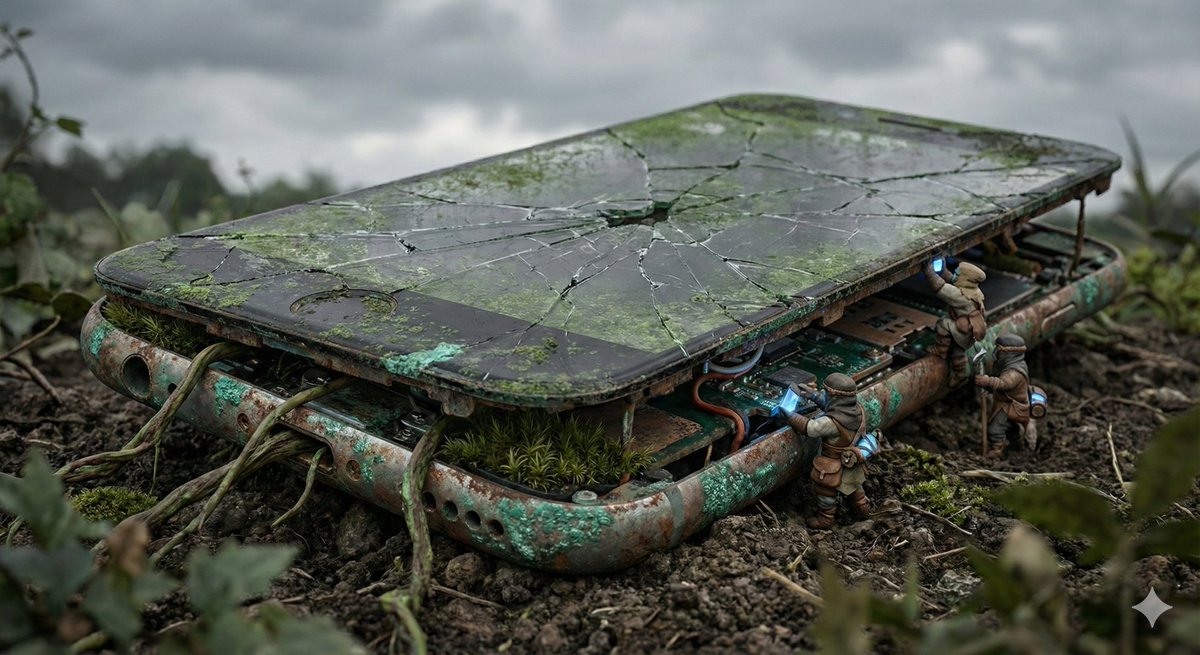 A ruined [ORDINARY OBJECT] centuries after civilization has fallen. Cracked surfaces, rust, overgrown vegetation, faded markings. Tiny [SURVIVORS] scavenging within it. Moody lighting, cinematic realism, environmental storytelling.