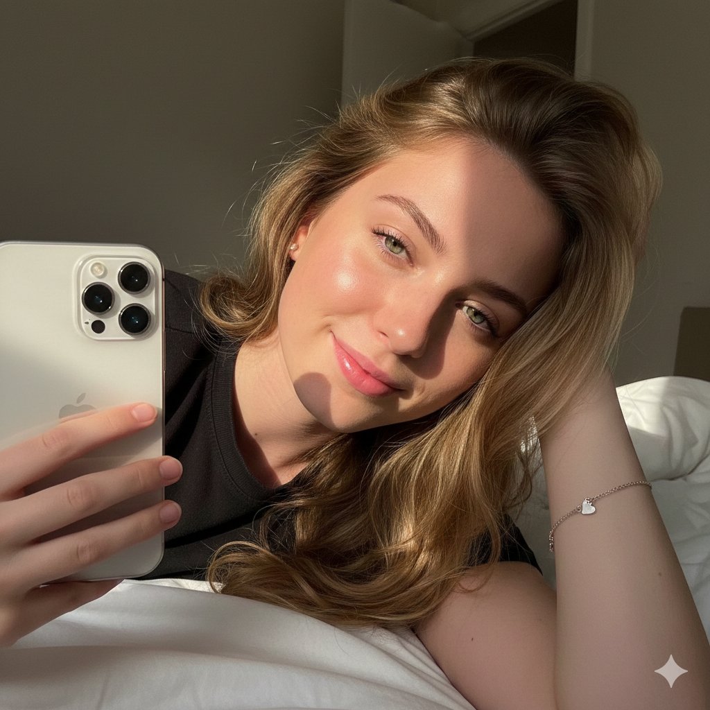 Gemini Nano Banana 3.0 Prompt { "image_generation_prompt": { "meta": { "type": "Photorealistic Portrait", "orientation": "Horizontal", "reference_mode": "img2img (Use uploaded face exactly)" }, "subject_details": { "reference": "Use uploaded face exactly", "demographics": "Young woman", "skin": "Fair with dramatic highlights on cheekbones", "hair": "Long, wavy, light-brown, shiny; strands partly covering face and lips; one eye visible through hair", "expression": "Soft natural smile" }, "pose_and_action": { "shot_type": "Close-up self-portrait (Selfie)", "camera_angle": "Low-angle shot from below", "hand_position": "Holding realistic iPhone 17 Pro, head resting on left hand" }, "attire_and_accessories": { "clothing": "Black t-shirt", "jewelry": "Heart-charm bracelet" }, "environment_and_lighting": { "setting": "On a bed", "light_source": "Warm natural side light from left window", "style": "Dramatic chiaroscuro", "atmosphere": "Intimate, natural" }, "combined_prompt_string": "Close-up horizontal selfie of a young woman on a bed, taken from low-angle. She holds a realistic iPhone 17 Pro, head resting on left hand, soft natural smile. Long wavy light-brown shiny hair partly covers her face and lips, one eye visible. Wearing black t-shirt and heart-charm bracelet. Warm natural side light from left window creates dramatic chiaroscuro highlights on fair skin and cheekbones. --cref [URL_TO_FACE_IMAGE]" } }