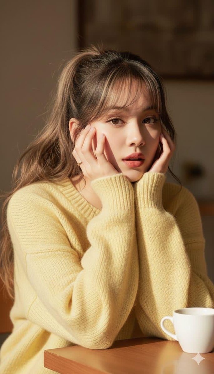 ​Lighting & Atmosphere: Warm golden hour sunlight creates strong shadows and highlights on her face. The lighting is cinematic and cozy. There is a white ceramic coffee mug on the table in the foreground. The background is a soft warm-toned blur (bokeh) suggesting a cozy room interior. High quality 8k soft focus aesthetic