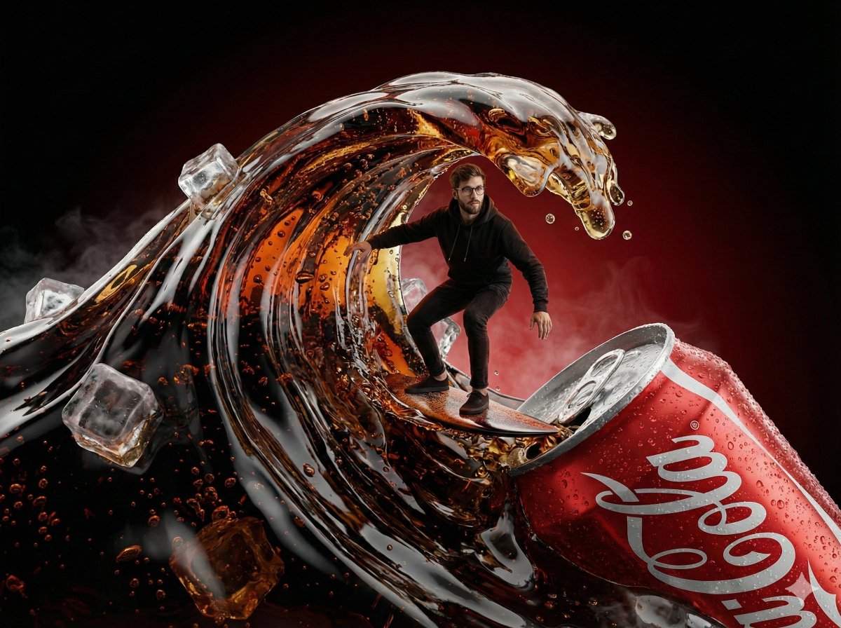Nano Banana Pro on Gemini app. Prompt: A vibrant fantasy-style soda commercial where a playful young man surfs an energetic orange soda wave exploding from a cold Fanta can. Juicy orange slices, bubbly liquid arcs, exaggerated motion, warm sunlight, colorful gradient background, joyful expression, dynamic pose, hyper-realistic splash effects, cinematic advertising look, 8K, ultra sharp, bold colors, no text, no watermark