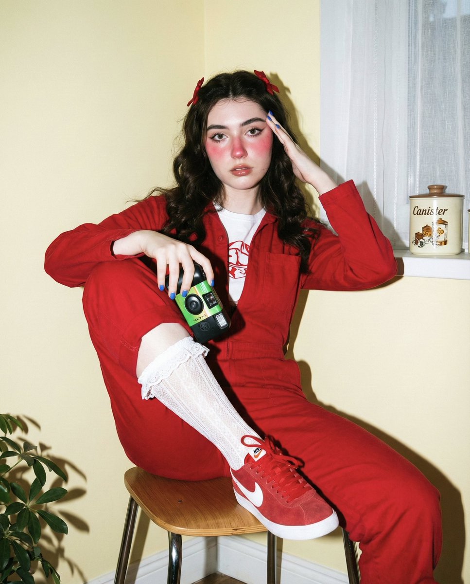 Gemini Nano Banana Pro Prompt: A vibrant, full-body shot, captured in a soft, vintage-style photograph, features a young woman with long, dark, wavy hair sitting casually on a wooden chair with metal legs. She wears a white t-shirt with a red graphic print layered under a full-length red jumpsuit with long sleeves, covering her from neck to toe. She still wears white knee-high lace socks with frilly tops and red sneakers with white logos for added retro charm. Her left leg is bent, with her foot resting on the chair, while her right leg extends forward. Her makeup is distinctive, with heavily flushed pink cheeks and nose, winged eyeliner, and glossy lips. Small red bows sit in her hair, and her fingernails are painted blue. In her left hand, she holds a vintage green and black point-and-shoot camera resting on her knee. Her right hand is raised, with her fingers touching her temple, giving a thoughtful or relaxed pose. The background includes a light yellow wall and a window with a sheer white curtain. To her right, a vintage-style “Canister” jar sits on the windowsill. A plant is visible in the lower left corner. The lighting resembles a direct flash, creating bright, slightly harsh illumination on the subject, highlighting her skin and clothing textures while casting sharp shadows. The warm, saturated color grading gives the image a playful, retro, dreamy aesthetic reminiscent of grainy film photography. Use photo reference for facial features.