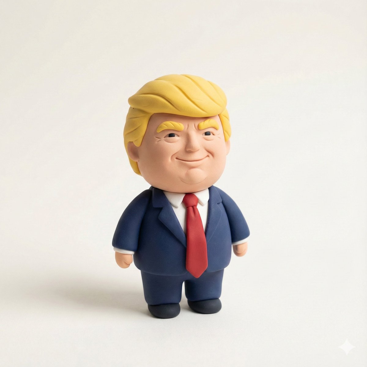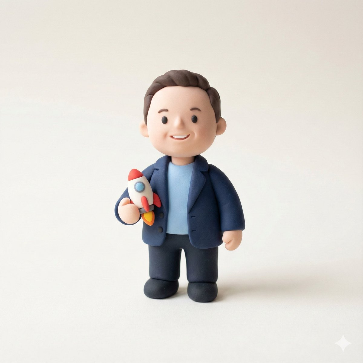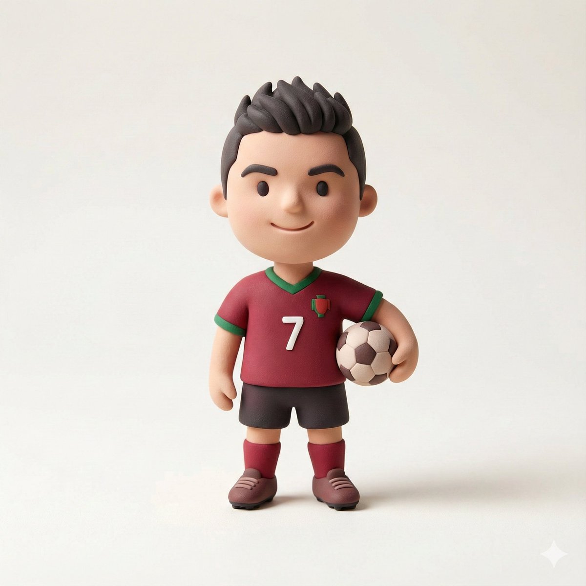 Create a stylized miniature model of [CHARACTERS] shaped entirely from soft polymer clay. The figure has rounded, childlike anatomy — large head, small body, and simplified details that feel friendly and handcrafted. Its outfit and accessories match [CHARACTERS]’ iconic look, modeled with smooth curves and lively, saturated tones.