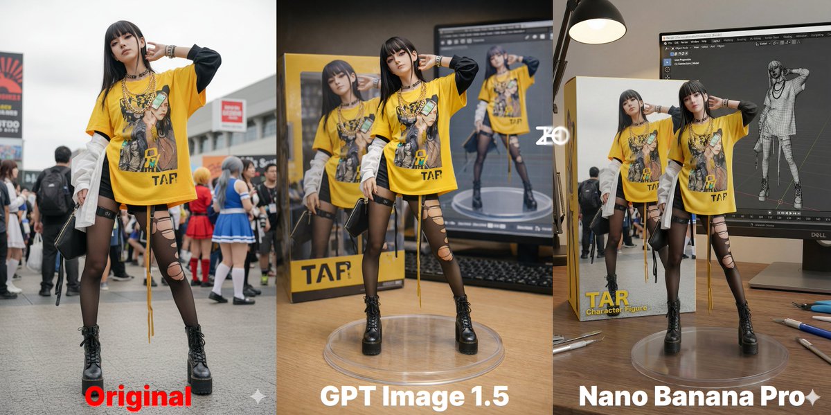 GPT Image 1.5 🆚 Nano Banana Pro 【手办测试】能力测试:【特征保持 + 风格迁移 + 多风格混合】 基本持平,在材质质感上 GPT 1.5 略好,在真实感上 🍌 Pro 略好 ZH5O|测试系列|GPT Image 1.5 【Prompt】⬇️