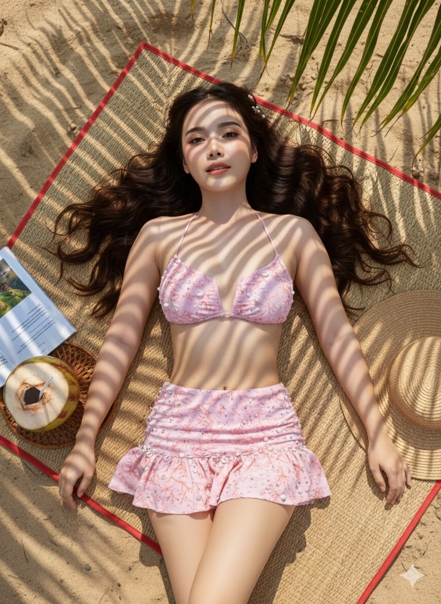 "textures": "Visible sand grains, woven mat texture, fabric embellishments"