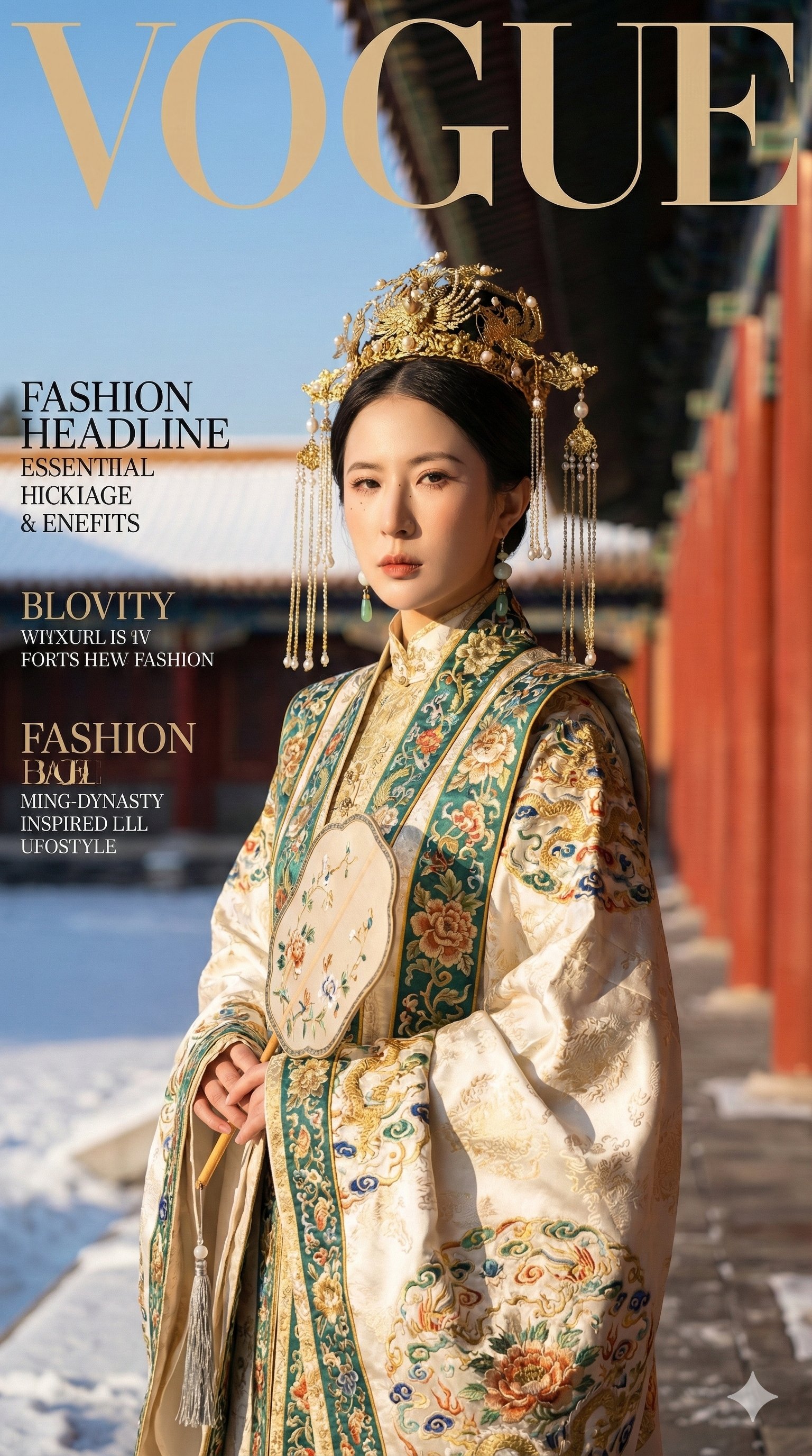 【PROJECT GOAL | 项目目标】 生成一张 9:16 竖版「高端时尚杂志封面级」写实照片:以我上传的 FACE_REF 为人物身份参考,100%还原五官与骨相;人物身穿“明制华丽礼服方向”的重工汉服(多层叠穿、手工刺绣/织金锦、贵重金饰头面),在故宫红墙长廊雪景中拍摄。画面具备《Vogue》《Harper’s Bazaar》《ELLE》《Cosmopolitan》《Marie Claire》《i-D》《Allure》《FLAUNT》级别的摄影、造型与封面设计,以上杂志随机任选一作为杂志的封面设计,并保持选择杂志的一贯设计风格(中英文设计)