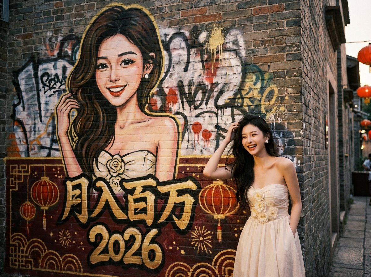 🔥朋友们这套提示词绝了!上传你的靓照就可以生成你跟自己的街头涂鸦合照,社媒疯传预定!