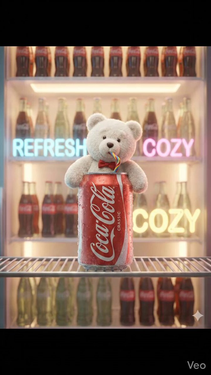 Prompt: A cute, cinematic brand fantasy scene featuring a fluffy white teddy bear mascot emerging from a chilled soda Coca-Cola can, holding a colorful striped straw.