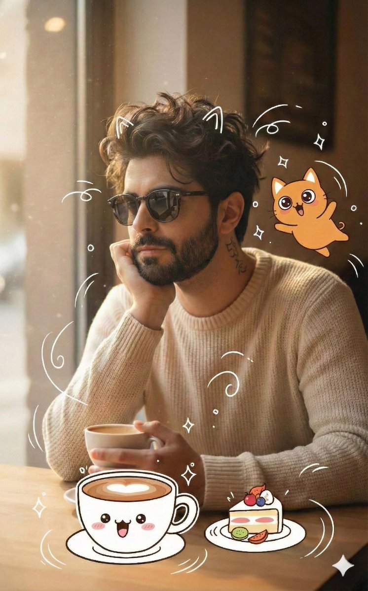"raw_text": "A cozy indoor portrait of a man sitting at a table holding a cup of coffee and resting his face on his hand. The scene is enhanced with playful hand-drawn cartoon doodles: a cute orange cartoon cat jumping excitedly beside his cat ears illustrated on her head, whimsical white sketch lines bubbles sparkles, and motion accents. A smiling cartoon coffee mug with foam a small dessert plate with cake and fruit illustrated in a kawaii style in the foreground.Warm natural daylight",