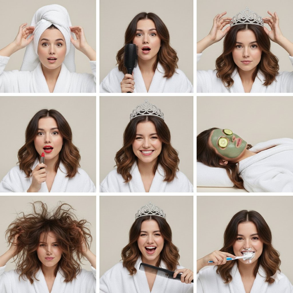 "scene_summary": "Create a 3x3 photoreal studio grid showing the SAME woman (strict identity lock) in a clean beauty-bathroom photoshoot vibe. Same neutral light-gray/white seamless background, same camera distance, same lighting. Wardrobe: white bathrobe throughout. Prop continuity: towel, tiara/crown, lipstick, hairbrush, comb, toothbrush, face mask, cucumber slices. Each tile shows a different playful 'getting ready' moment. Keep faces fully visible in every tile.",