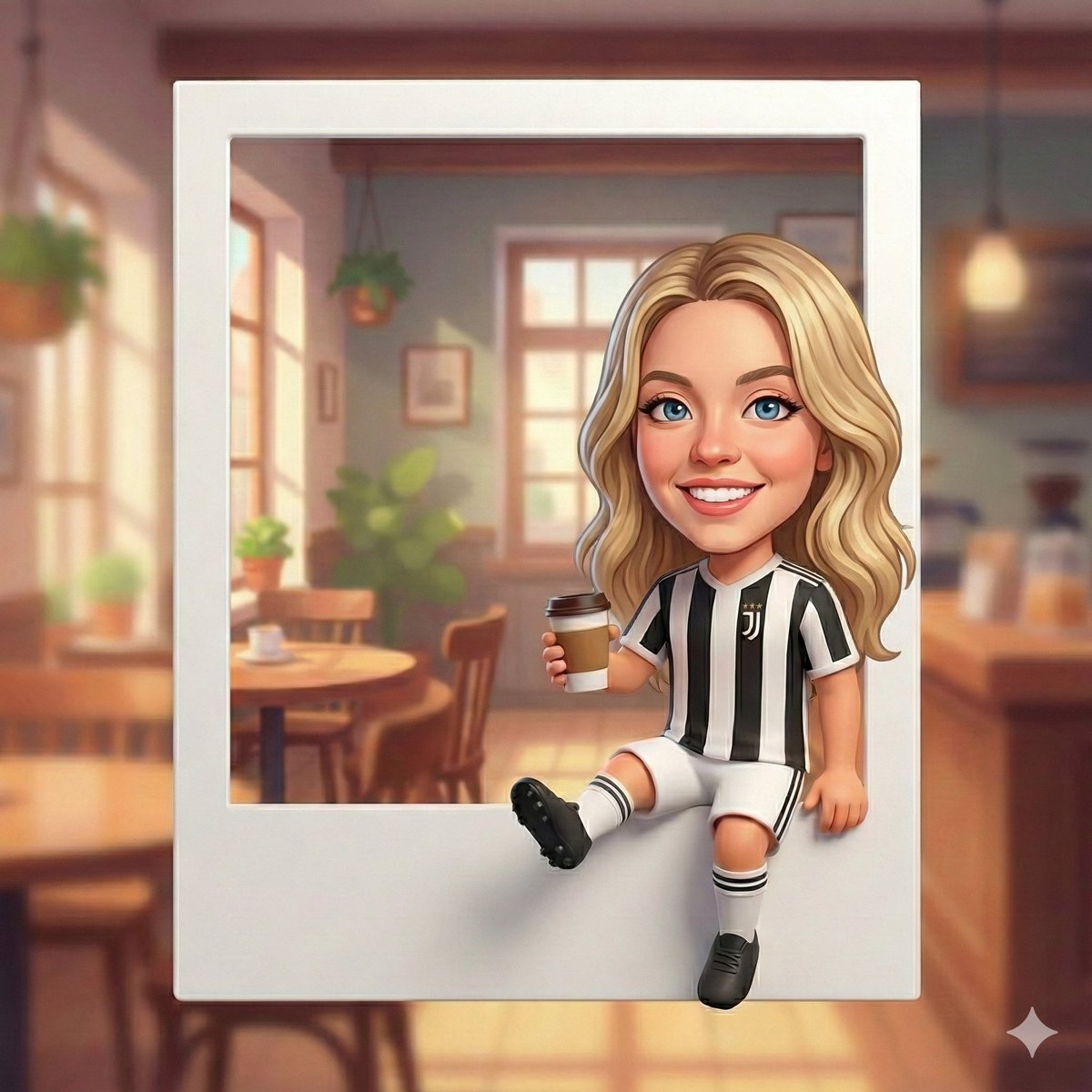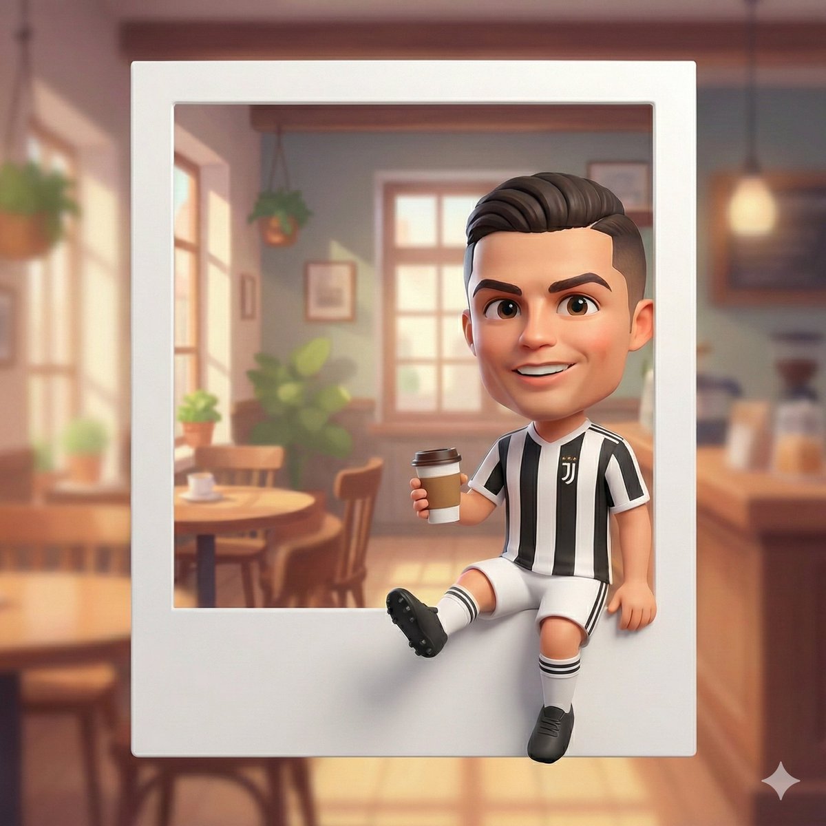 A cute 3D chibi-style cartoon character, sitting on the edge of a white Polaroid photo frame, wearing a black and white striped football jersey, white shorts, long socks, and black cleats. The character holds a takeaway coffee cup and smiles confidently. Stylized big head, expressive eyes, smooth skin, and detailed hair with a modern fade. Cozy café interior in the background with wooden tables, chairs, warm sunlight through windows, soft depth of field, pastel tones, Pixar-quality 3D render, ultra-detailed, soft lighting, cinematic composition, playful and premium look, square aspect ratio.Use my below prompt to create these images of your favourite character on Google
