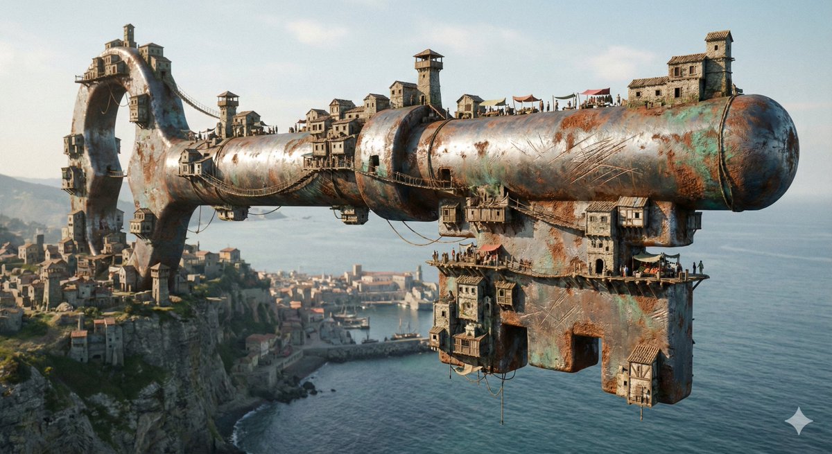A colossal [EVERYDAY OBJECT] reimagined as a fully inhabited city. Tiny [PEOPLE / SOCIETY] build homes, roads, markets, and infrastructure directly into the object’s structure. Photoreal materials, lived-in wear, soft daylight, wide cinematic perspective with deep storytelling.Object Turned Civilization Gemini Nano Banana Pro Prompt: A colossal [EVERYDAY O