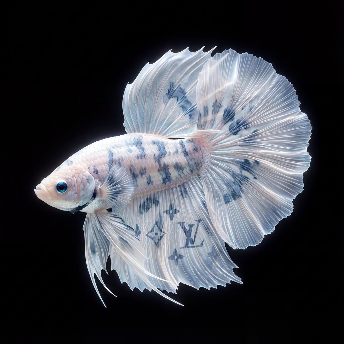 这是艺术还是广告? 一条完美侧面的白色斗鱼,身上的蓝色纹理藏着Louis Vuitton的图案。但它们不是印上去的,而是像锦鲤斑纹一样自然生长出来。 提示词核心