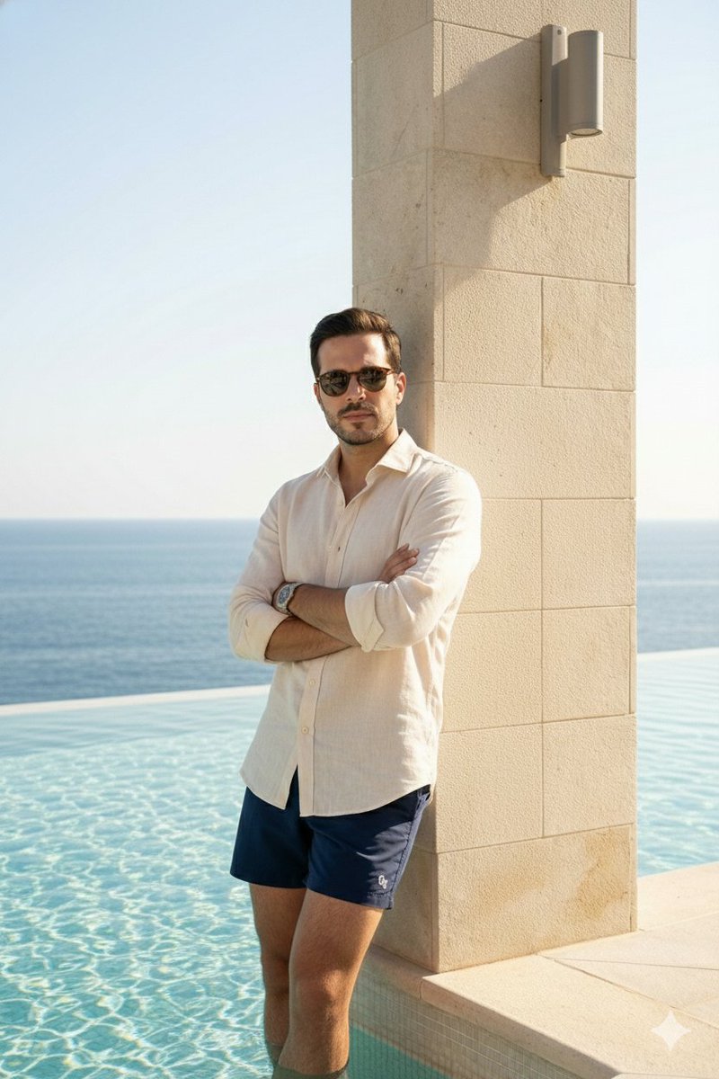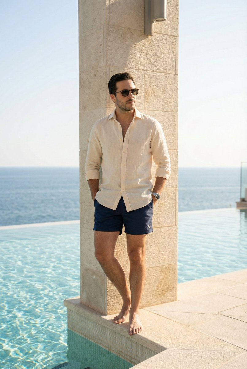 Create a high-quality, editorial-style photoshoot of the same man as in the reference, at a luxurious swimming pool during daytime. The scene has bright sunshine and perfectly clear weather. He is alone, posing classically and confidently for the camera as if for a fashion magazine cover. The lighting is minimal yet sophisticated, highlighting his face and outfit with soft, natural contrast. He is wearing a fashionable, well-tailored outfit suited for a summer poolside editorial, stylish, modern, and elegant. The pool water glimmers under the sunlight, with reflections adding depth and vibrance. The background is clean, with no people around, emphasizing the premium, cinematic aesthetic and polished magazine look.