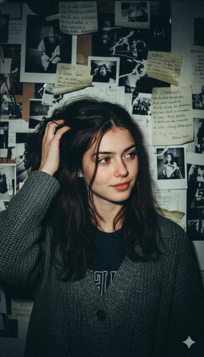 A young woman, same face preserved, lit by a harsh on-camera flash from a thrift-store film camera. Her hair is loosely pinned, stray strands shadowing her eyes. She gives a knowing half-smirk. Sheβs wearing a charcoal cardigan with texture. Behind her: a cluttered wall of handwritten notes and torn film stills. The shot feels like a raw indie-movie still β grain-heavy, imperfect, intentional.