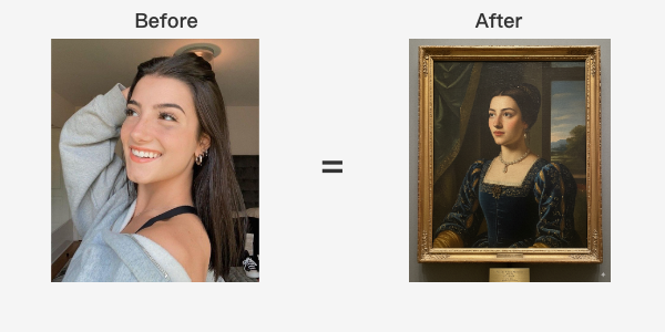 Recreate the photo in the style of a Renaissance master painting with oil paint textures, classical lighting techniques, and period-appropriate clothing. Add subtle cracking effects, golden frame edges, and museum-quality presentation with informational placard.